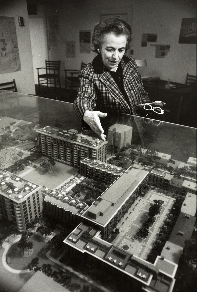 Architect Chloethiel Woodard Smith presenting a model of her Harbour Square project for Southwest Washington, DC, c. 1960, Library of Congress, Prints and Photographs Division, LC-DIG-ppmsca-31775