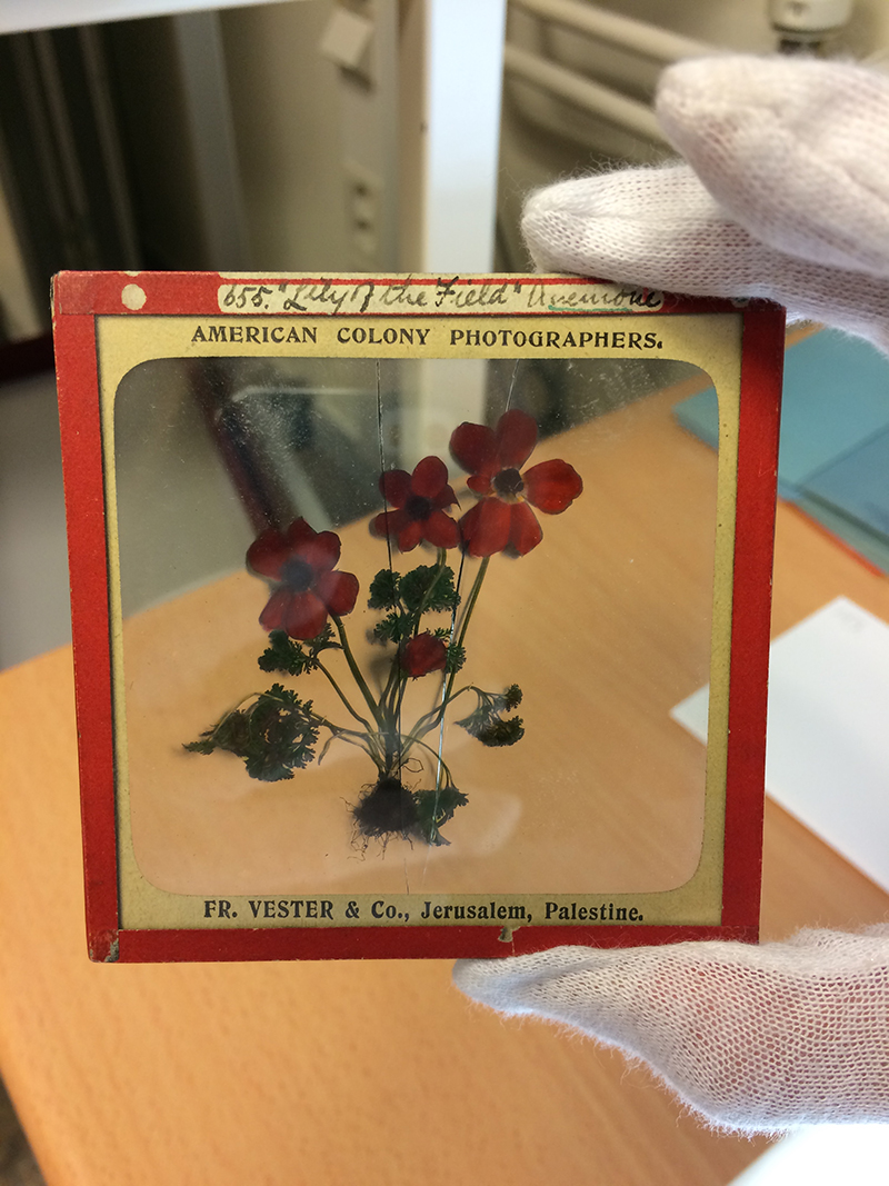 “Lily of the Field” Anemone, c. 1910–1925, hand-colored glass slide, Uppsala University Library Special Collections, American Colony Photo Department Glass Slide Collection. Photo: Nisa Ari