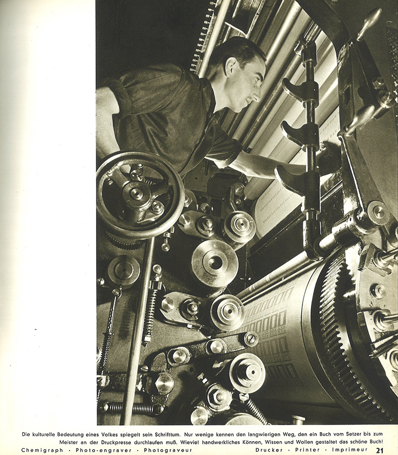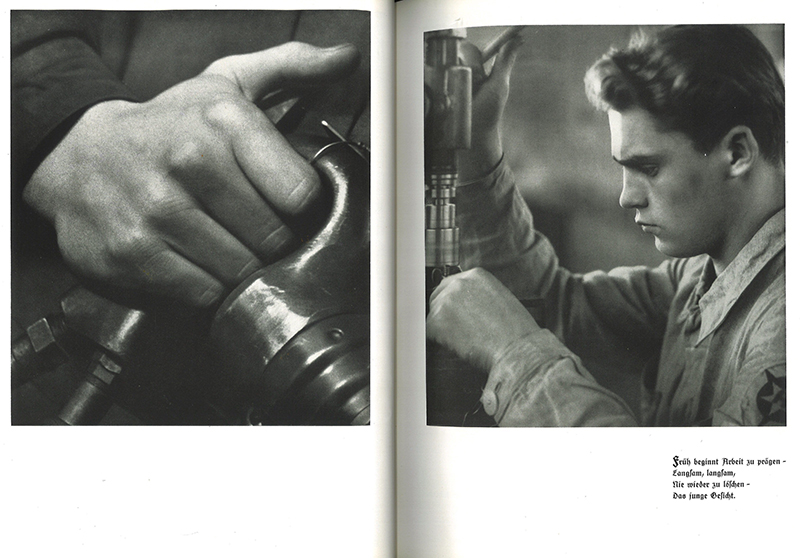 The contributions of Wolff and Lendvai-Dircksen to the discourse of Arbeitertum can be analyzed through their formal treatment of the constitutive tension between class and folk and its reconciliation in the figure of the German worker. For both, his empowerment—and he is almost always male—is predicated on the alliance between industry and state; its ultimate goal is the identity of work and folk community. Formally, these relationships are articulated through the visual framing of worker and machine, the use of composition and lighting, and the implicit assumptions about work, industry, and community as personified by the German worker. Arbeit! consists of 200 black-and-white images printed in high-quality photogravure, with descriptive captions in German, English, and French. Documentary in style, these photographs show individual workers quietly honing their skills in the optical, mechanical, and chemical industries or working together in small groups on industrial construction sites, in coal mines, and at steel mills. Commissioned by the Henschel Werke in Kassel, Lendvai-Dircksen’s book features 95 traditional portraits of blue- and white-collar workers, with only about half depicted at their workplaces. As the title suggests, “Work Forms the Face” is based on three propositions: that work, whether physical or intellectual, leaves traces on the face; that these traces can be preserved and deciphered; and lastly that they are reducible to conventional notions of social type or professional habitus. For Wolff, industrial modernity meant the merging of worker and machine; for Lendvai-Dircksen, it was an affirmation of German character. Yet, for both, the fate of industrial modernity was inseparably connected to the Nazi state—a connection that deserves closer examination, not least in order to gain a better understanding of the socialist imaginaries and racialized iconographies that survived long into the postwar years.