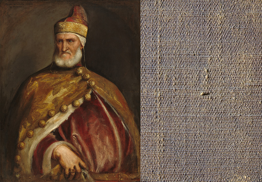 The National Gallery’s portrait of the Venetian ruler Doge Andrea Gritti (c. 1546/1550) by Titian emanates authoritative, pulsating presence. The image appears to vibrate subtly, conveying the vitality of a breathing being and recalling Ludovico Dolce’s praise of the artist’s capacity to infuse pictures with life: “egli cammina di pari con la natura: onde ogni sua figura è viva, si muove, e le carni tremano” (he walks in step with nature: every one of his figures is alive, it moves, and its flesh trembles). This impression of life force is even more striking since it was probably a posthumous portrayal. Two afterlives are at stake here: Andrea Gritti’s, and that of the painting itself. Remarkably, the artwork has escaped conservation/restoration interventions such as lining that have critically altered the original surface qualities of paintings. It retains a rich texture—one born during the process of creation from the interplay among Titian’s paint-loaded brush, a thin ground layer, and a rough canvas with an irregular weave pattern. The insistently uneven relief of this canvas is foundational and essential to the impact of the finished painting: the yarn patterns interrupt the strokes of paint, inviting a broken mark, disrupting planes, disallowing precise contours, contributing to vibrantly variegated coloristic effects, and ultimately to the slightly out-of-focus, tremblingly alive quality of Gritti’s portrait. As such, to understand how Doge Andrea Gritti came into being and how it achieves its impact, we must attend to the support: both to this piece of fabric in its specific materiality and to canvas as an (art-)historical phenomenon.