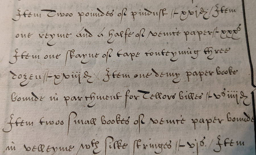 Detail from accounts of stationery issued to offices of the Exchequer, including an early mention of “Venice paper,” 1594, The National Archives, Kew, E407/68. Reproduced by permission of The National Archives
