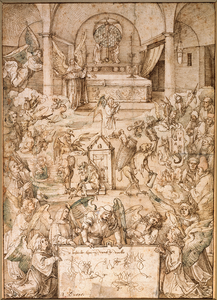 Albrecht Dürer, Mass of the Angels, or The Recording of the Thoughts of the Pious and the Wicked (detail), c. 1500, watercolor, gouache, pen and brown ink, 30.5 × 21.7 cm, Musée des Beaux-Arts, Rennes. Photo: Louis Deschamps, Ó RMN-Grand Palais / Art Resource, NY