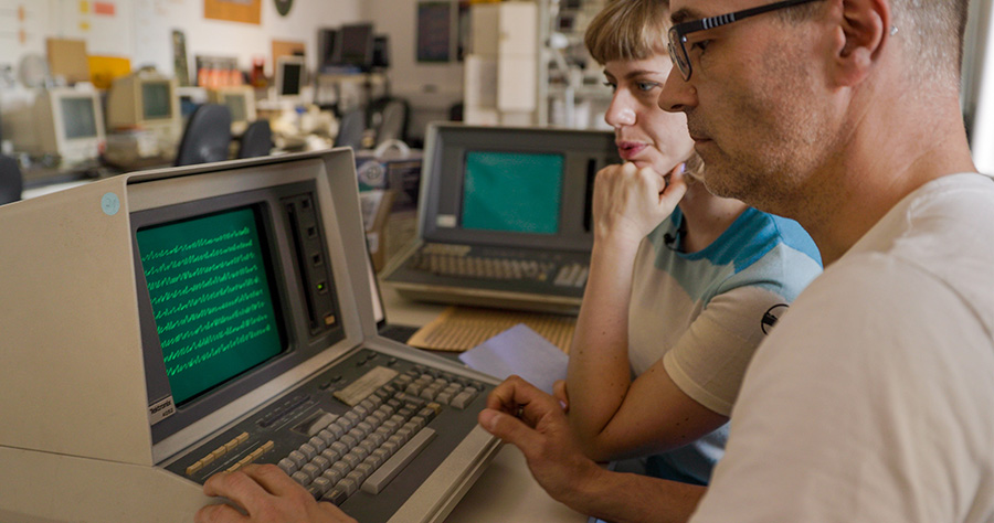 Stefan Höltgen and Zsofi Valyi-Nagy reenacting Vera Molnár’s Lettres de ma mère on a Tektronix 4052 microcomputer, Signallabor, Humboldt-Universität zu Berlin, June 2022. Photo: Julia Sandor, Artykfilm