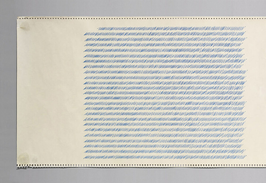 Vera Molnár, Lettres de ma mère (detail), 1988, plotter drawing in india ink on Calcomp roll paper, overall: 30 × 450 cm, Musée de Grenoble. Photo: Jean-Luc Lacroix
