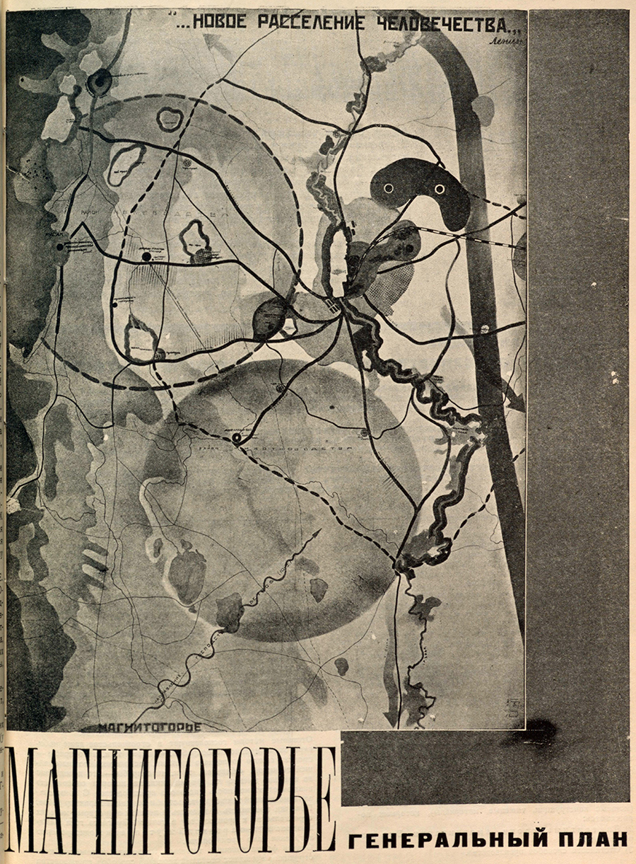 Mikhail Barshch, Vyacheslav Vladimirov, Mikhail Okhitovich, and Nikolay Sokolov, with Georgy Vegman, Nina Vorotyntseva, Alexander Pasternak et al., Magnitogorye (competition project), 1930, from Mikhail Barshch, Vyacheslav Vladimirov, Mikhail Okhitovich, and Nikolay Sokolov, “Magnitogorye,” Sovremennaya arkhitektura, no. 1–2, 1930