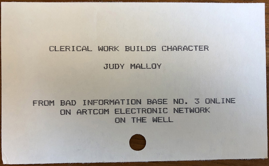 Judy Malloy, Catalog card from Bad Information Base No. 3, c. 1986, Stanford University Libraries, Special Collections Department, Art Com records, c. 1970–2005, box 253. Photo: Erin Dickey