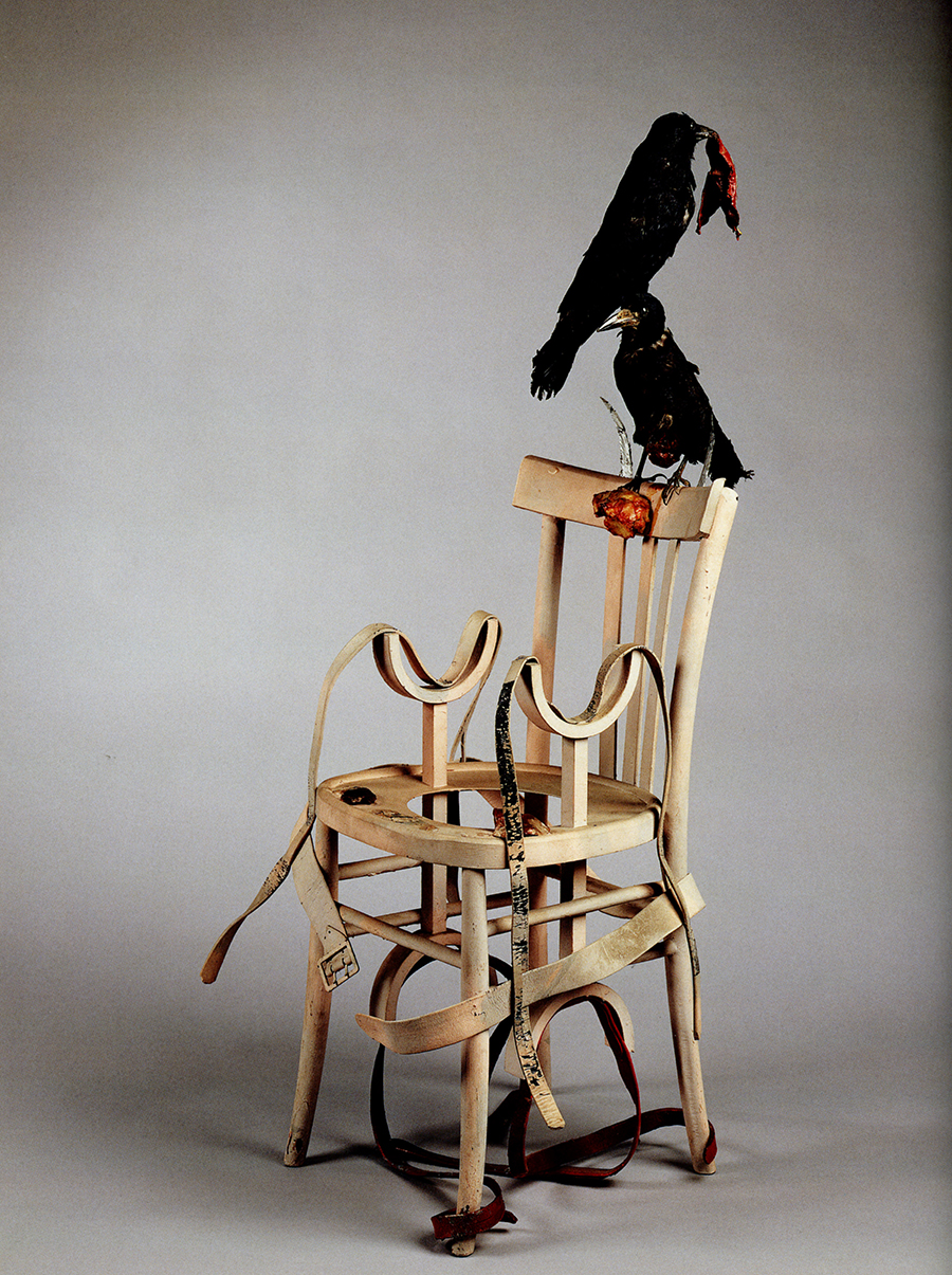Paul Thek, Untitled (Chair with Crows and Meat), 1968, chair, leather straps, paint, taxidermic animals, and wax, Kolumba Museum, Cologne. © Estate of Paul Thek