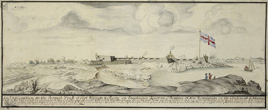 In 1705, on the eve of his return to London from North America, the German English engineer Wolfgang William Romer (1640–1713) prepared a perspectival watercolor, entitled Prospect Draft of Fort William & Mary on the Piscataqua River in the Province of New Hampshire on the Continent of America, to serve as a record of the fort’s completion. Viewed from a rocky outcrop to the south, the fort’s freshly mortared stone ramparts and a newly constructed wooden palisade are set between a ship in the harbor at right and the silhouette of “the Towne of New Castle” at left. Smoke emanates from the chimneys of the “old Guardhouse” as well as the “new mad Lodgings,” though both buildings are obscured by the low viewpoint, which conceals rather than exposes the engineer’s accomplishments. Instead, the panoramic view emphasizes the fort’s surrounding landscape, with labels A through S identifying civil and natural as well as military sites, including: M) “Part of the Province of Main [sic]”; R) “Justice Atkinson’s house”; and even S) “The Province Gally Capt. Cyprian Sauthack Commander.” Looming above the scene is a billowing, oversize Union Jack, an irrefutable claim of English supremacy in a colonial outpost.