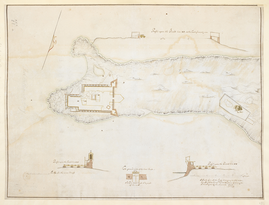 Wolfgang William Romer, Prospect Draft of Fort William & Mary on the Piscataqua River in the Province of New Hampshire on the Continent of America, 1705, ink wash on paper, The British Library. Courtesy of the British Library, K.Top.120.29