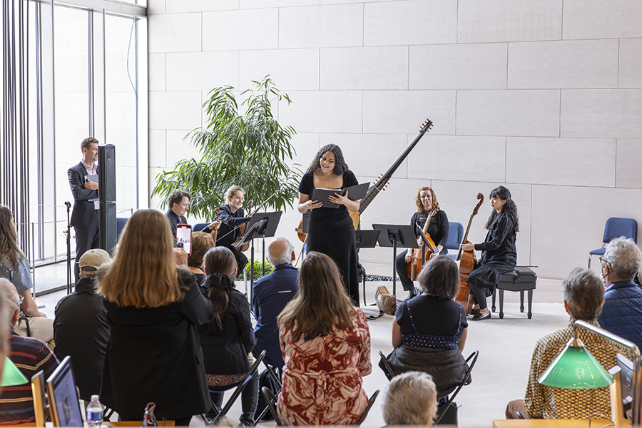 Sonnambula, joined by Juilliard students from the music and drama divisions, performing in the National Gallery of Art Library at Women in Art and Music: An Early Modern Global Conference, October 2023