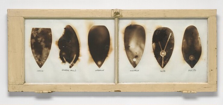 The imprints of six steam irons mark this work on paper. Beneath each silhouette, in large capital letters, is the name of an iron manufacturer—Casco, General Mills, Monarch, Silex, Presto, with one "unknown." What do we make of this image, framed in an old window?