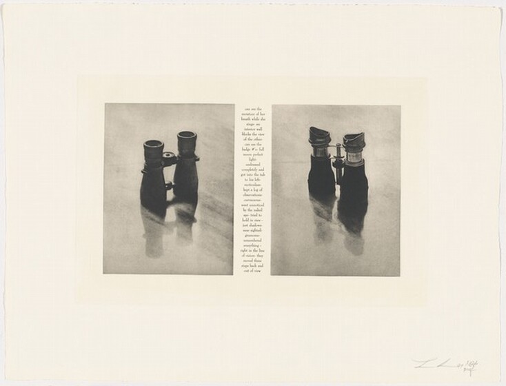 The artist presents two binoculars and, between them, a series of phrases. You might pick up one of these looking devices—perhaps to spy?—and thus see what the text haltingly, disjointedly describes. But Simpson has placed the binoculars face down, simultaneously promising and frustrating vision. Text and binoculars each furnish only partial knowledge, underscoring the inherent problem of relying on only written or visual information to understand a person or situation. Simpson has examined the relationship between text and image over many years, challenging concepts of truth, history, and identity. Here, gaze is thwarted by its instruments, and knowledge is crippled by incompleteness. You may assign meaning to this image, but Simpson reminds the viewer: it is not necessarily correct.