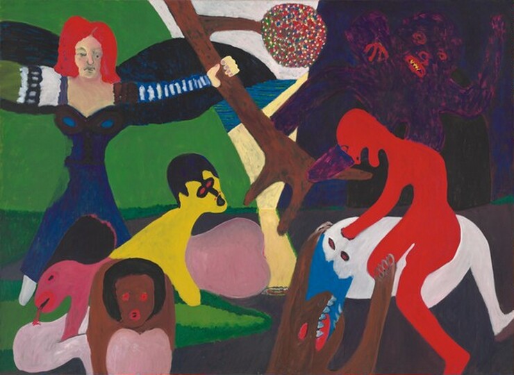 Bob Thompson's Tree is based on the fantastical, morally charged work of Francisco de Goya, the Spanish master known for his scathing commentary on the Spanish royalty and religious persecution in the late 18th century. Thompson's painting combines two consecutive plates from Goya's 1799 collection of etchings Los caprichos: Volaverunt (They Have Flown) on the left and Quien lo creyera! (Who Would Have Thought It!) on the right. Instead of merely re-creating Goya's etchings, however, Thompson produced a different narrative by modifying the characters and adding new elements. Goya's adulteress becomes a redheaded, winged angel holding an uprooted tree. Her human form watches over several bestial figures, suggesting that human reason presides over primal instincts. To unify Goya's two images, Thompson incorporated the color red throughout the work and positioned the tree on a diagonal.