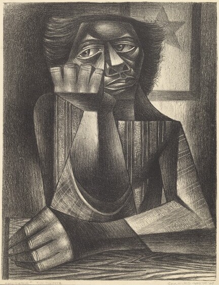 This work is known by two titles: Mother and Awaiting His Return. The woman who dominates the composition stares into space, her strongly modeled figure a study in patience. Given the work's date (1945), the framed star in the background (a symbol of the US military), and the word mother inscribed in the lithograph's lower left corner, the two titles make equal sense. The woman's face is easily interpreted as that of a mother waiting for a loved one to return from service in World War II. Artist Charles White has chiseled her facial features with determination while infusing her expression with sadness. The cubist faceting of her figure imparts a feeling of solidity and strength in her that is reinforced by her imposing size and foreground placement. Her hands and face are nearly architectural, with their sharp edges and straight-line markings of light and shadow. Yet her tired eyes, her chin set into the palm of her hand, and the merest hint of doubt in her expression signal concern.