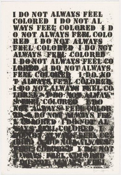 Untitled: Four Etchings [A] (above) and [B] repeat, over and over, sentences from Hurston's essay: "I do not always feel colored" [A] and "I feel most colored when I am thrown against a sharp white background" [B]. As the viewer reads, the texts become increasingly difficult to decipher. Smudged and broken type interferes with legibility, suggesting the viewer's literal and intellectual struggle to read the sentence and understand its implications.
