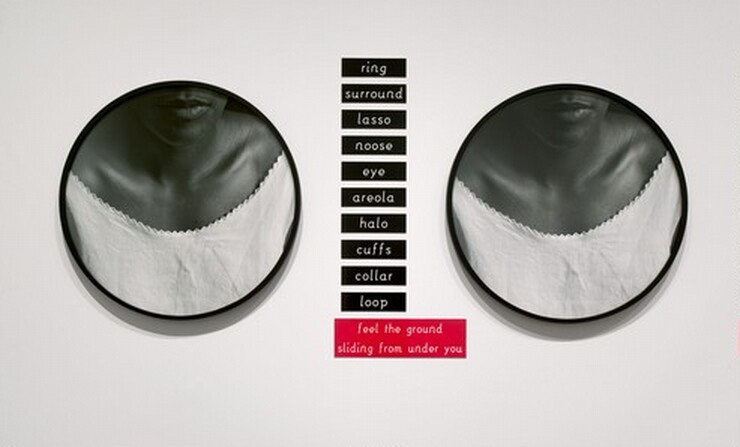 In Untitled (Two Necklines), identical photographs of an unidentified African American woman, shown from mouth to breastbone, hang in circular frames, between them a list of words engraved on plaques. The double image suggests tranquility and composure: the woman's white shift is clean and simple, her mouth at ease, the curve of her breastbone elegantly arced. But the plaques feature words describing circularity and enclosure that are ominously electrified by text on the final plaque, which reads, "feel the ground sliding from under you."