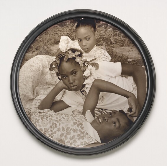 May Flowers, a compelling photograph of three young African American girls, succinctly addresses the issues of race, class, and gender that the American artist Carrie Mae Weems has explored for decades. Related to a video Weems made in 2002 titled May Days Long Forgotten, the photograph evokes both spring’s renewal and May Day, the international workers’ holiday. Befitting these themes, May Flowers depicts girls from working-class families in Syracuse, New York, wearing floral-print dresses. Its tondo format, truncated foreground space, and tight focus on the figures harks back to Renaissance paintings of the Madonna and child, while its subject—adolescent girls with flowers in their hair, lounging on the grass—recalls both 19th-century paintings and photographs, such as those by Édouard Manet and Julia Margaret Cameron. Weems intensified this historical character by printing the photograph in sepia tones and placing it in a circular frame like those gracing the walls of 19th-century parlors.