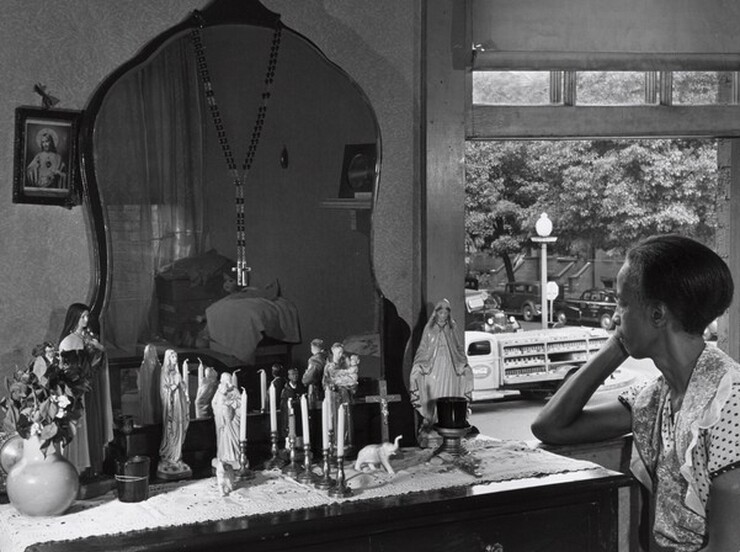 A rich and complex religious practice is displayed in the Washington, DC, home of Ella Watson, a cleaning woman who worked for the Farm Security Administration (FSA) during World War II. Her altar—composed of statues of St. Thérèse of Lisieux, Our Lady of Lourdes, St. Joseph, St. Martin de Porres, St. Anthony, and Our Lady of the Immaculate Conception, as well as two elephants, two crucifixes, candles, and a rosary—intermingles with her everyday life reflected in the mirror. Appearing in the reflection is a child’s doll propped against stacked boxes, while Watson herself wears a floral apron over her polka-dot dress. Through her open window, a Coca-Cola delivery truck and lush summer foliage are visible at the intersection of 11th and P Streets, in northwest Washington. Over the course of a month, the photographer Gordon Parks created a series of about 90 pictures of Watson, including his most iconic photograph, Washington, D.C. Government Charwoman (American Gothic), in which he posed her with a broom and a mop before an American flag. Made under the auspices of the Historical Section of the FSA, which was headed by Parks’s mentor Roy Stryker, the series was not published by the government at the time.