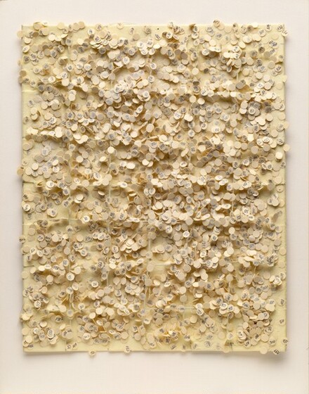 Untitled, #20 is a collage both intricate and seemingly precarious in its construction. Hundreds of small circular pieces, remnants from a hole-puncher, cover the surface of the paper. Some lie flat while others cluster in piles or hang off the edges. A grid created by monofilament provides a substructure for the outwardly haphazard composition, and a light coating of powder imparts an iridescent quality. Although numbered, each piece is randomly placed. The use of numbers and a grid suggests a mathematical and perhaps methodical approach to balancing randomness and premeditation.