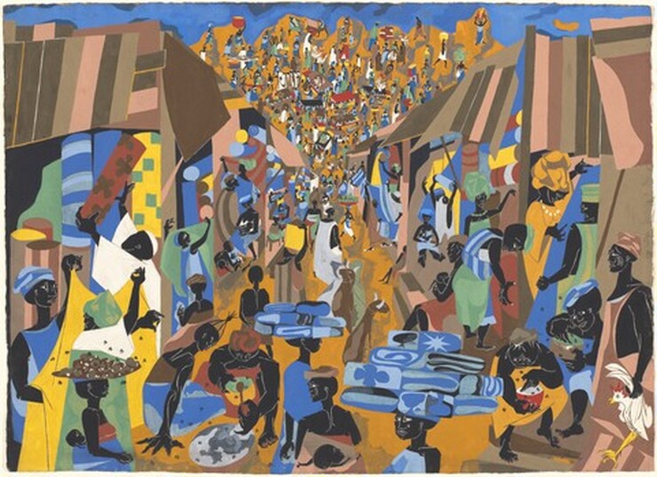 In Street to Mbari, Jacob Lawrence captured the flurry of a busy outdoor market in Nigeria. Shops line either side of the street while a maze of vendors awaiting discovery fills the distance. The viewer becomes part of the scene amid a crowd of people, young and old, buying and selling. One can almost hear babies crying, chickens squawking, and people chattering as they discuss fabrics and produce. A cacophony of primary colors heightens the sense of commotion. Rolls of fabric show off different patterns and color combinations. Strips of corrugated iron in varying sizes and colors form the shops' roofs and create a visual rhythm across the top of the painting.