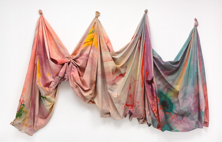 Sam Gilliam's draped paintings such as Relative pushed the notion of what painting was and could be. By moving his canvases off their stretcher bars, Gilliam allowed them to shift and flow as fabric is meant to do. The folds in the canvases, however, were not created at random but instead reflect Gilliam's specific idea about how he wanted his paintings to be installed. Relative, while still hung on a wall, becomes a part of its setting and interacts with and within that space. Lighting in the room affects the way shadows from the canvas fall on the wall. Physical movement around the painting can cause the fabric to stir, altering our perception of it. The ample folds demonstrate the painting's flexible properties, highlighting nuances of stained colors and hinting at what the creases conceal. Viewers can indulge in the continuous play between action and stillness, bright color and dark shadow.