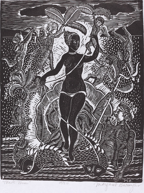 In this linocut print, artist Margaret Burroughs responds to a 1793 work by Thomas Stothard called Voyage of the Sable Venus from Angola to the West Indies. Also a reference to Botticelli’s Renaissance painting The Birth of Venus, Burroughs’s print—made during the civil rights movement—positions a Black subject as the goddess of love, affirming the beauty and power of Black women. In addition to her artistic practice, Burroughs was an activist, educator, and fixture of Chicago’s South Side community, founding the South Side Community Art Center and the DuSable Museum.