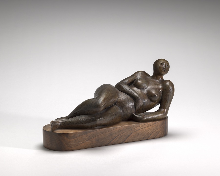 In Reclining Female Nude, Catlett emphasizes the hips and breasts of her subject, contrasting them with the figure’s small and stylized head. The artist took inspiration from both African and Mexican sculpture and positioned her work in conversation with contemporary European artists such as Henry Moore and Constantin Brâncuşi.
