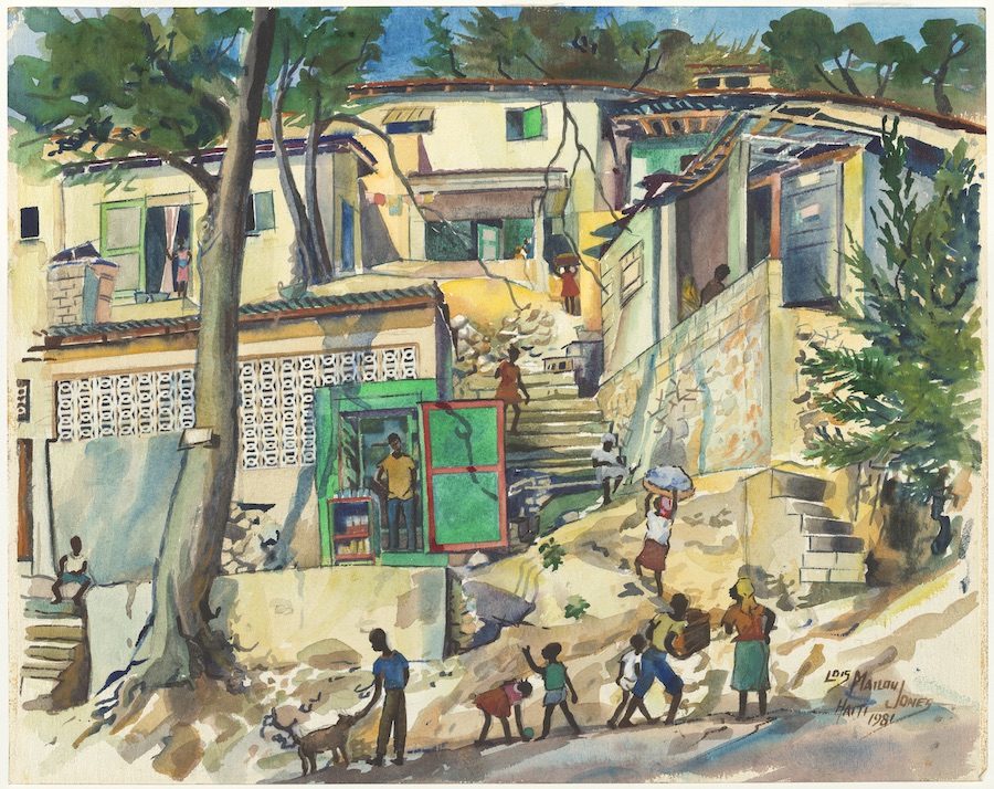 The artist Lois Mailou Jones often visited the Caribbean nation of Haiti, depicted here, during her life, through her marriage to Haitian artist Louis Vergniaud Pierre-Noel. In this scene of everyday life, Mailou Jones has taken care to show adults and children at work and at play, living in a dense community of brightly colored stacked houses.