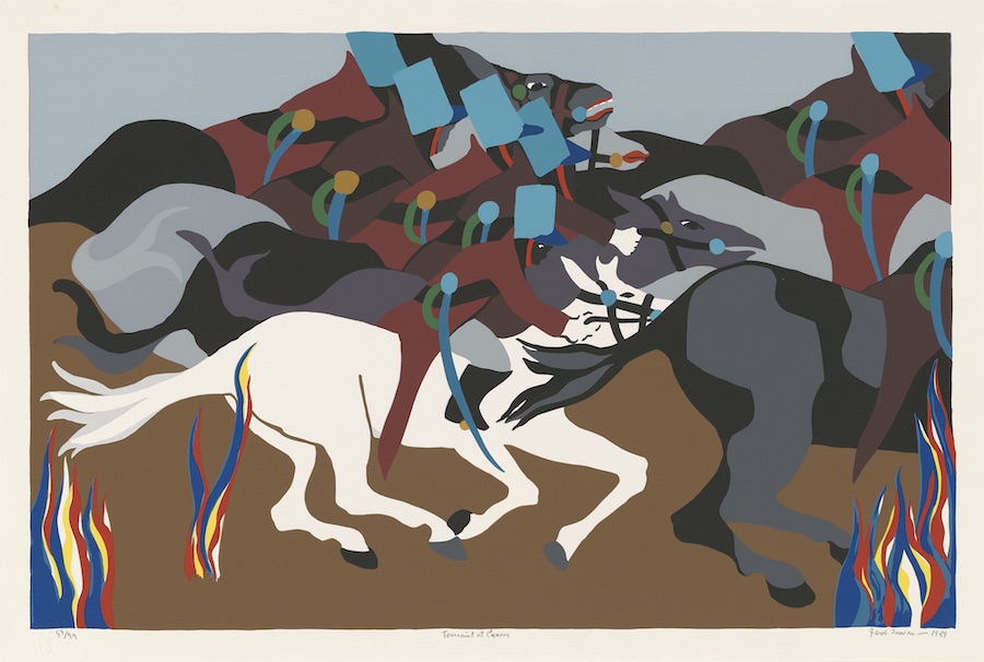 This screenprint by Jacob Lawrence is one of several works he made about the life of Toussaint L’Ouverture, the revolutionary who led Haiti in pursuing independence from France and the abolition of slavery. In this scene, we see soldiers on horseback with long coats, blue hats, and swords hanging at their sides as they ride into battle. The blur of shapes and colors heightens the drama and intensity of the action.
