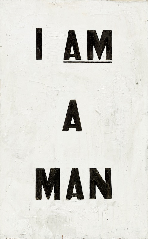 Untitled (I Am a Man) is a representation of actual signs carried by more than 1,300 African American sanitation workers on strike in Memphis in 1968. Prompted by the wrongful deaths of two coworkers from faulty equipment, the strikers—joined by Martin Luther King Jr.—marched to protest low wages and unsafe working conditions. They took up the slogan “I Am a Man,” a variant on the first line of Ralph Ellison’s novel Invisible Man (1952): “I am an invisible man.” This slogan and these signs were used throughout the civil rights movement of the 1960s and continue to be used today.
