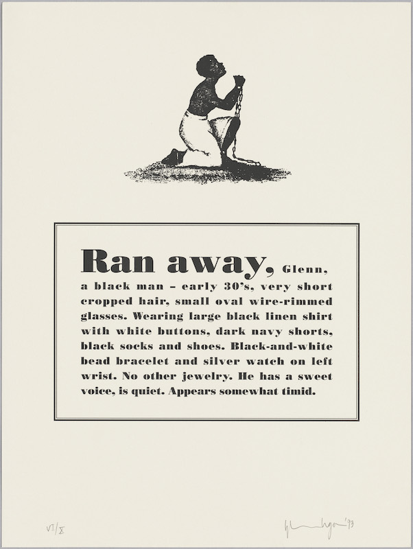 In this series of lithographs, artist Glenn Ligon recreates “runaway” advertisements published in antebellum newspapers. The text of each lithograph is based on how Ligon’s friends chose to describe him if he went missing. While the descriptions focus largely on Ligon’s physical features, they also include specific notes about his personality and behaviors, as did many 19th-century fugitive notices. While running away was a form of self-emancipation for enslaved people, it did not guarantee self-determination.
