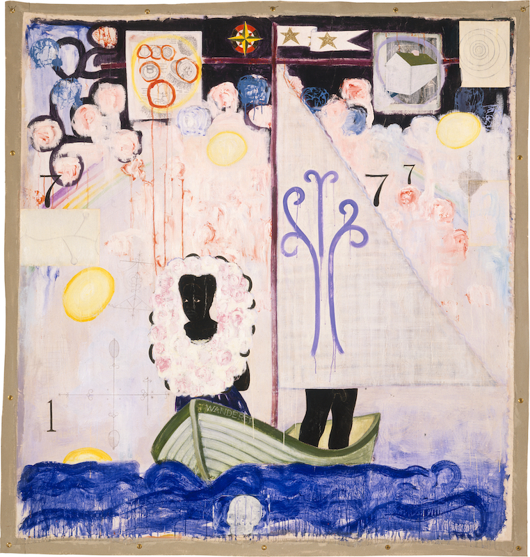Marshall’s Voyager, depicting two partially obscured Black figures standing aboard a ship, refers to an actual ship, Wanderer. The Wanderer was among the last slave ships in the United States, illegally transporting more than 400 individuals from West Africa to Georgia in 1858—even though the importation of enslaved people had been banned in 1808.