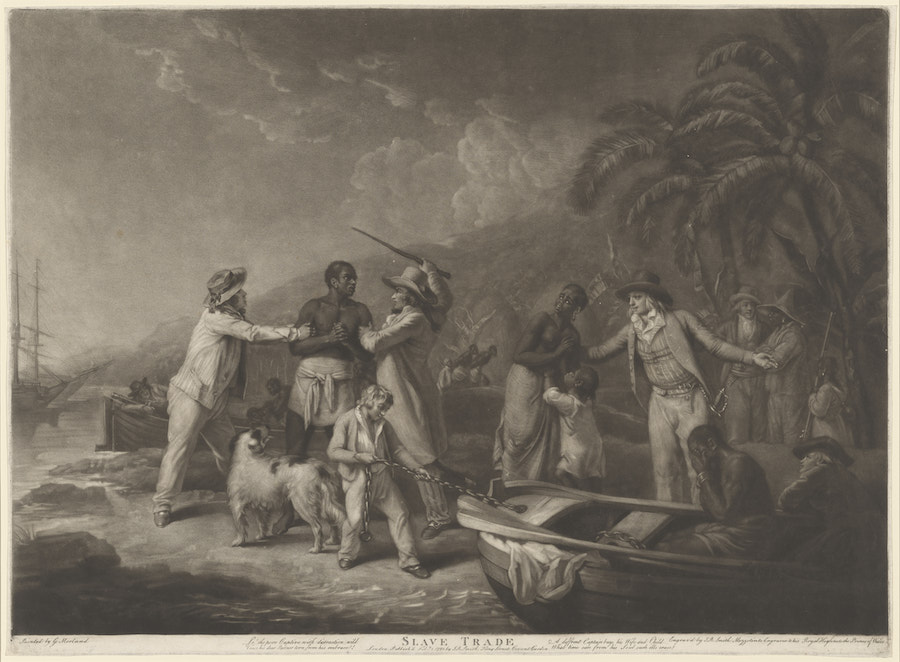 Slave Trade is a print based on George Morland’s 1788 original painting of this scene. In a setting on an African coast, a fictional African family is separated and enslaved by European sailors. Though this scene is imagined, Morland drew from descriptions of enslavement that circulated in the news at the time. Morland was among the first to produce a scene of the slave trade.