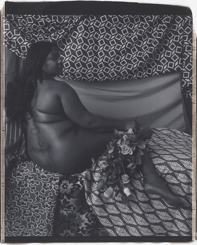 Here, the artist Mickalene Thomas portrays her subject in a position where the phrase “only God can judge me” is visible as a tattoo on her lower back, the words reasserting control over her portrayal of the Black body.