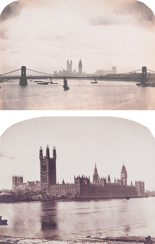 (bottom) Roger Fenton (1819 - 1869), Houses of Parliament, c. 1858, albumen silver print, 34 x 41.7 cm (13 3/8 x 16 7/16 in.), Courtesy of the Royal Photographic Society Collection at the National Museum of Photography, Film & Television, Bradford