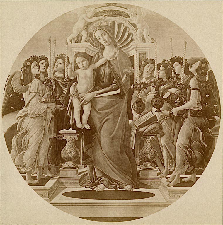 Sandro Botticelli (1446–1510), Madonna and Child with Angels Carrying Candlesticks, c. 1485/1490, oil on poplar panel. This tondo by Botticelli was called “cosa bellissima” (thing of beauty) by Vasari, but today only the frame (not pictured) remains. Commissioned by director Wilhelm von Bode specifically for this work, the frame was left at the museum during the war in order to conserve space in the Flakturm, and thus survived the war undamaged.
