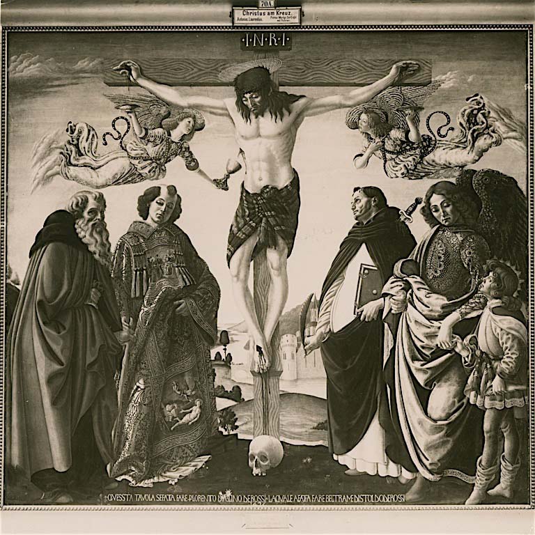 Francesco Botticini (1446–1497), Christ on the Cross and Four Saints, c. 1475, oil on poplar panel. This work was notable for its skillful rendering of 15th-century Florentine fashions, as well as its anachronistic depiction of Biblical and religious figures wearing such contemporary clothing.