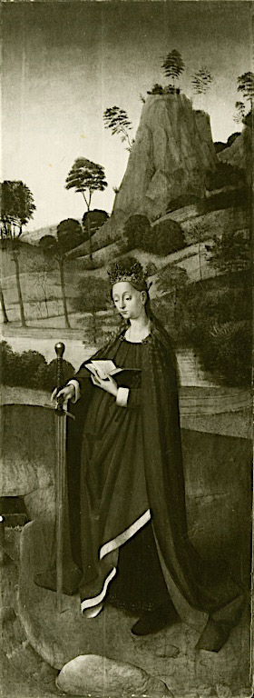Petrus Christus (active 1444–1475/1476), Saint Catherine, c. 1470/1475, oil on oak panel. Originally part of a triptych, this panel and its companion, Saint John the Baptist, were the largest of Christus’s known works. They even outsized the central panel that once fit between them, Death of the Virgin, now located in San Diego, California.