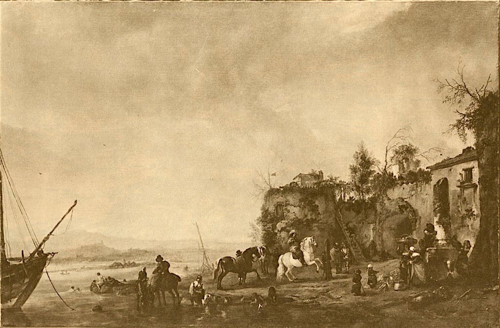 Philips Wouwerman (1619–1668), Riding School on a Riverbank, mid-17th century, oil on canvas. Before being evacuated from the museum, this painting was displayed alongside works by Rembrandt and Jacob van Ruisdael in one of a series of galleries representing the best of Dutch Baroque painting. Wouwerman no doubt earned a place in the collection for his masterful portrayals of equestrian scenes, but since its loss, his work is no longer represented in the Bode Museum.