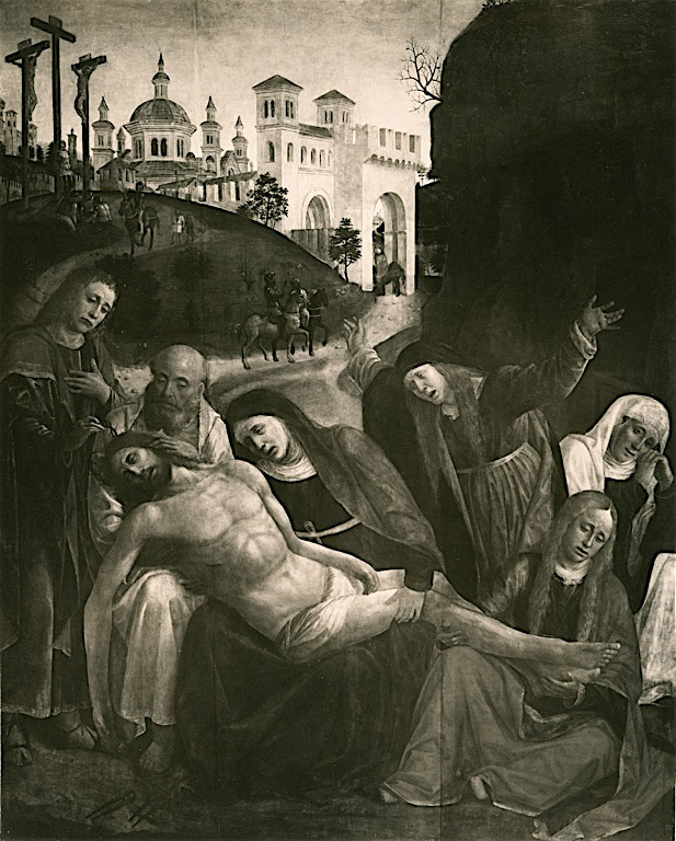 Vincenzo Foppa (c. 1430–1515/1516), Christ Mourned, n.d., oil on poplar panel. This work marked a trend toward powerful and realistic expressions of grief in depictions of the Lamentation as opposed to the more understated facial expressions and movements that were common at that time.