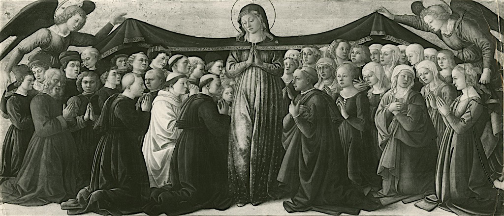 Fra Filippo Lippi (c. 1406–1469), Madonna as Mother of Mercy, mid-15th century, oil on poplar panel. Part of a Pistoian altarpiece designed by Pesellino, this composition was by Fra Filippo Lippi, although his workshop may have done some of the painting. While the figures surrounding the Madonna kneel to her, they are proportionately equal to her in size, a departure from other versions of the Madonna of Mercy.
