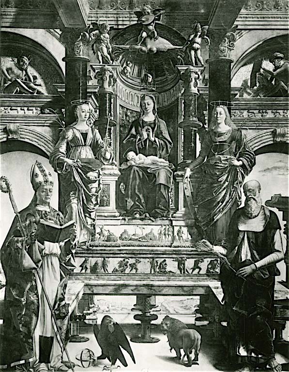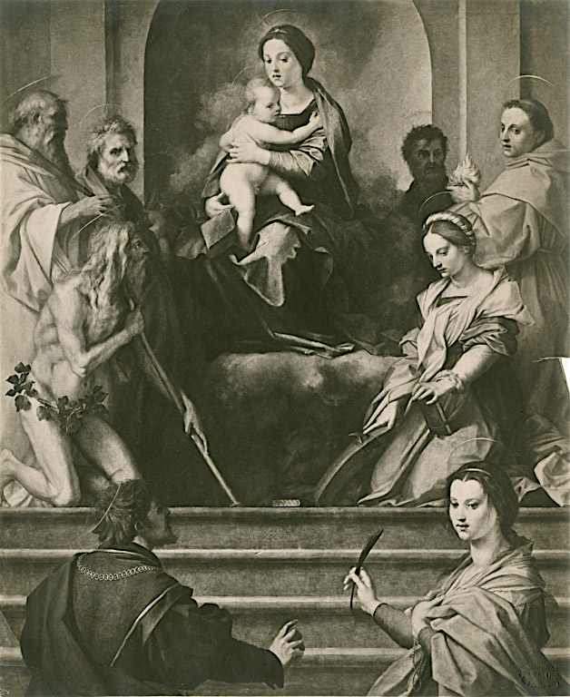 Andrea del Sarto (1486–1530), Madonna and Child Enthroned with Saints, 1528, oil on poplar panel. Painted just two years before his death, this was one of the artist’s final works, with coloring that was described as “magnificent.”