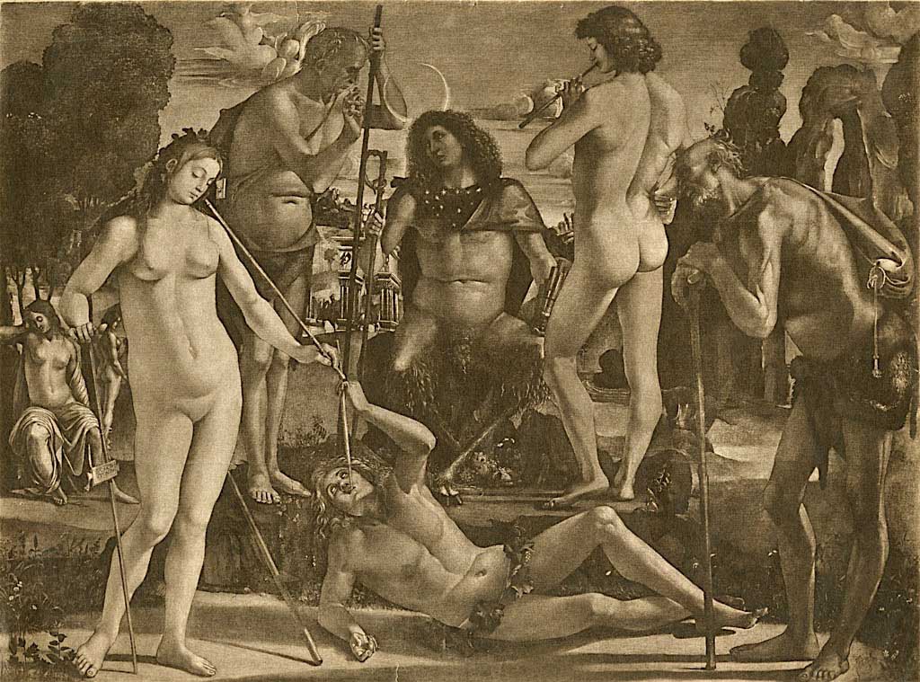 Luca Signorelli (1445/1450–1523), Pan with His Companions Making Music, c. 1489–1490, oil on canvas. Also known as The School of Pan, this monumental painting was a jewel of the Kaiser-Friedrich-Museum due to its size, historical significance, and complex layers of meaning. Painted by Signorelli for the ruler of Florence, Lorenzo de Medici, it was due to be moved to another location a few months before the fire, but the new facilities could not accommodate the size of the canvas, sealing the fate of this and many other large-scale works housed in the Flakturm Friedrichshain.