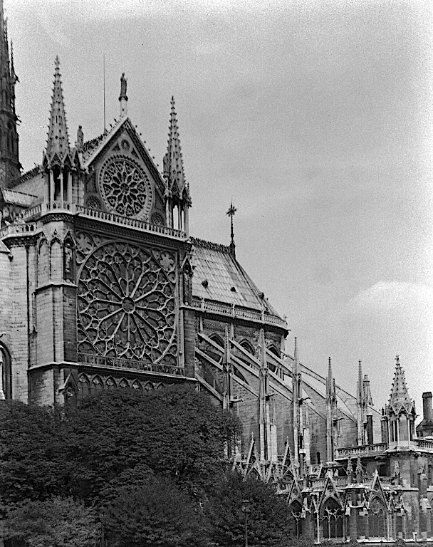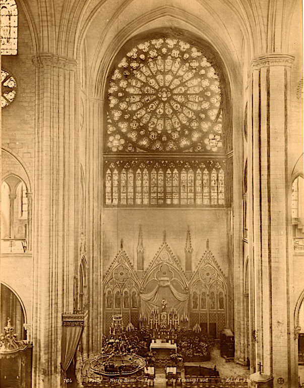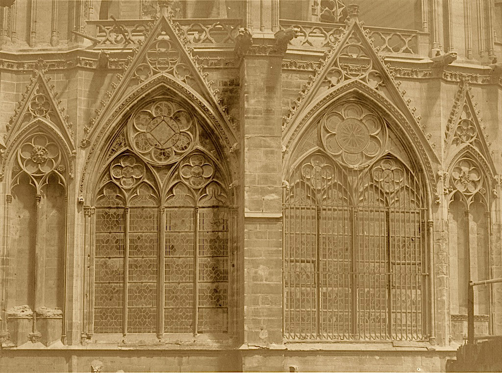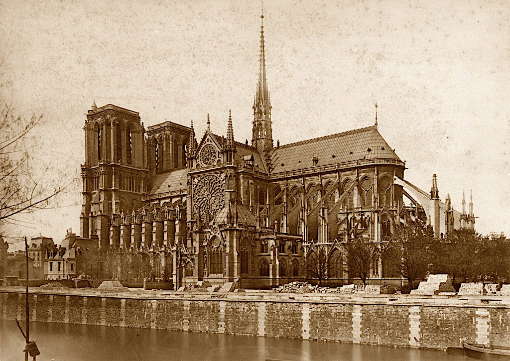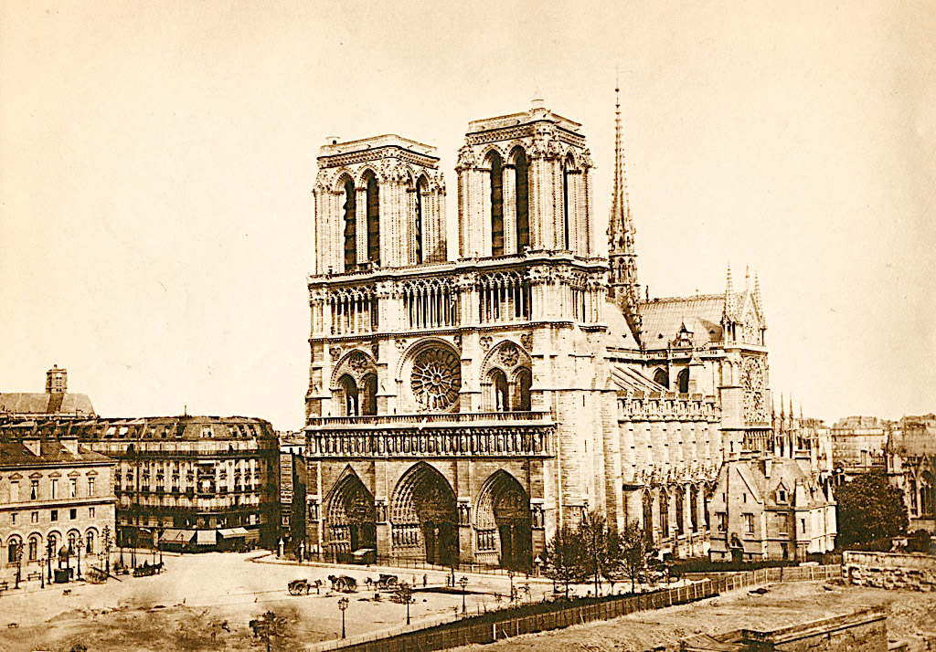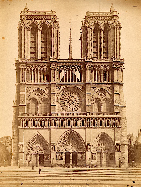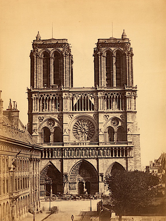 This is the first of three views showing changes during the 19th-century restoration. Note the Galerie des Rois (Gallery of the Kings) arcade, which dates to the first third of the 13th century, with representations of the Kings of Judah. In this earliest of the three photos of the west façade, the arcade is empty, as it was before the architects Viollet-Le-Duc and Lassus began their reconstruction of Notre-Dame in 1844. At that time, none of these statues remained, having been destroyed during the Revolution as symbols of royal despotism. Note, also, that there is no spire; the original was taken down in 1786 because it was unstable.