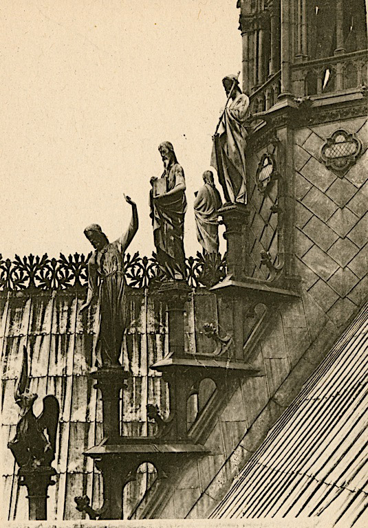 Viollet-le-Duc replaced the spire, removed in the 18th century, with a more idealized Gothic spire complete with statues of the 12 apostles and symbols of the four evangelists. These statues were removed for restoration days before the fire began. The spire was topped with a wrought-copper rooster, an unofficial symbol of France, and was recovered after the fire.