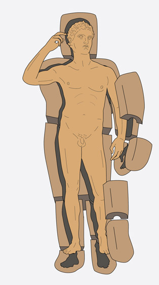 2. Molds of clay or plaster were formed around the model in sections corresponding to the head, arms, torso, and legs, and then disassembled. (These piece-molds were used to prepare a wax replica of the original model; the original model was put aside and saved for future use.)