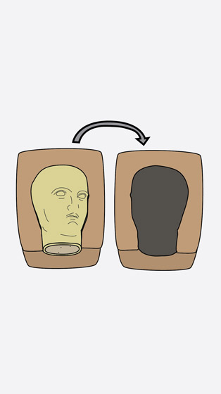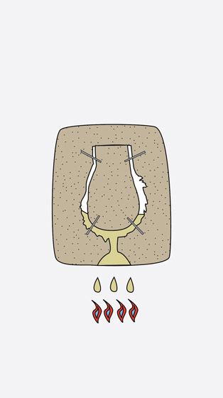 6b. The casting mold was turned upside down and heated, melting out the wax and leaving a void in the shape of a wax replica.