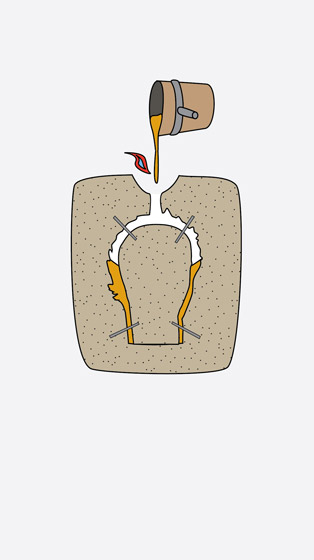 6c. Molten bronze was poured in, surrounding the core and filling the interior of the casting mold.