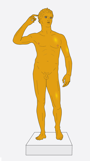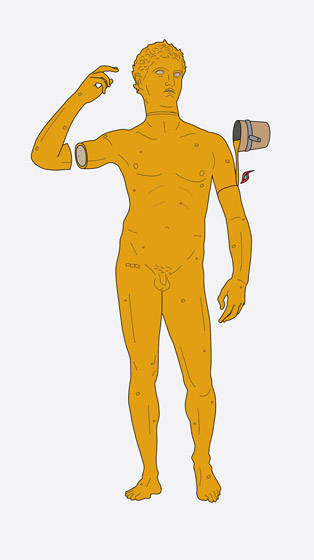 8. Separately cast parts (here the head and arms) were fused to the torso by pouring molten metal along the joints. The surface of the assembled sculpture was cleaned, chiseled, and polished. The metal surface was treated to protect it and produce the desired color.