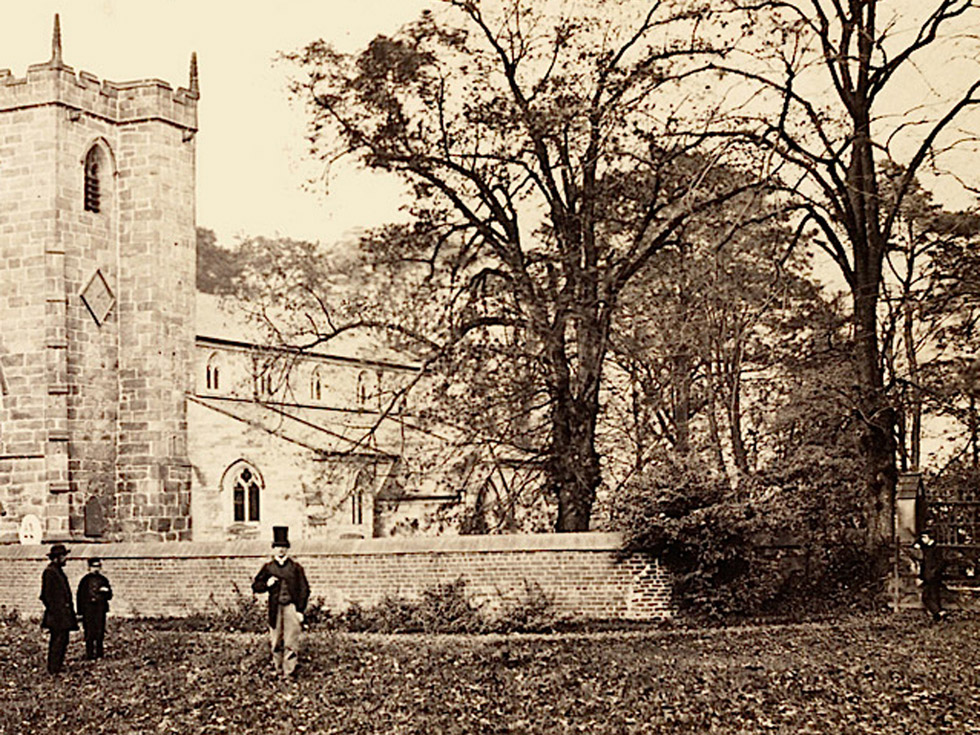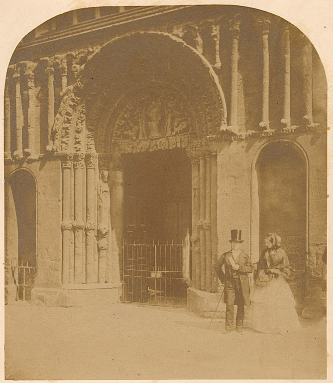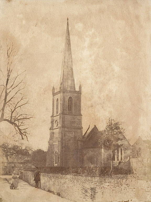 This image of the church at Winterbourne is one of a group of four photos of churches taken in April and May of 1859. These Gloucestershire churches, including Pilning (next photo), Frenchay, and Almondsbury, all lie within a five-mile radius, and each had been recently built or restored. The late 12th-century church at Winterbourne underwent a massive renovation beginning in 1843. The photographer may have asked these passers-by to pause to lend scale to his composition.